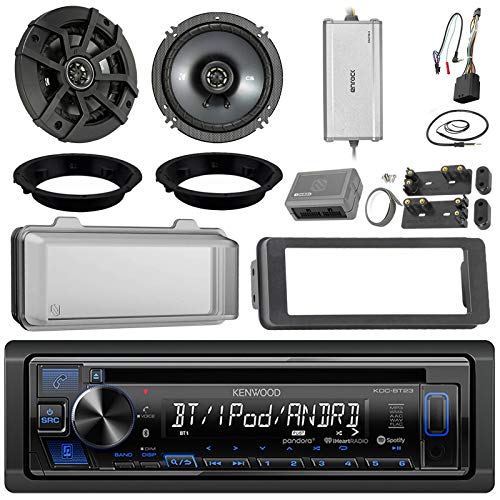 - PACKAGE BUNDLE KIT INCLUDES: Kenwood KDC-BT23 In-Dash 1-DIN CD/MP3 USB Bluetooth Car Stereo Receiver = 1 Pair Of Kicker 43CSC654 6.5" Inch Car Speakers - 1x Sosche SAHD656 Mounting Adapter Bracket Mounts Plate Ring For Harleys - 1 Enrock Marine/Outdoor 4-Channel Marine Amplifier - 1 Scosche HD7000AB 1998-2013 Harley Touring Install Adapter Dash Kit - 1 Scosche HDWS1B Radio SplashGuard Cover - 1 Scosche HDSWC1 Handle Bar Interface Controller - 1 Enrock 22" Wire Antenna.