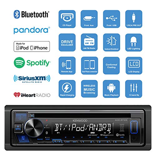 - STEREO RECEIVER UNIT: Upgrade your vehicle's entertainment system with this Kenwood KDC-BT22 Single-DIN In-Dash CD Receiver with Bluetooth. Not only will it play CDs, but the USB port enables connection of an Apple iPhone or iPod or a mass storage device to expand your listening enjoyment.